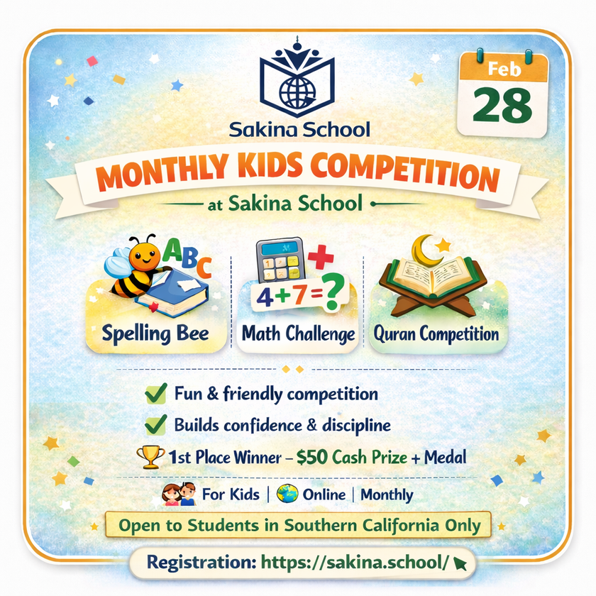 Monthly Kids Competition, Feb 28 Monthly Kids Competition, Feb 28 Save $0.00 0 0 / total reviews: () Regular price $0.00 Monthly Kids Competition, Feb 28 Sakina School Quantity Decrease quantity for Monthly Kids Competition, Feb 28 Increase quantity for Monthly Kids Competition, Feb 28 Enroll Now